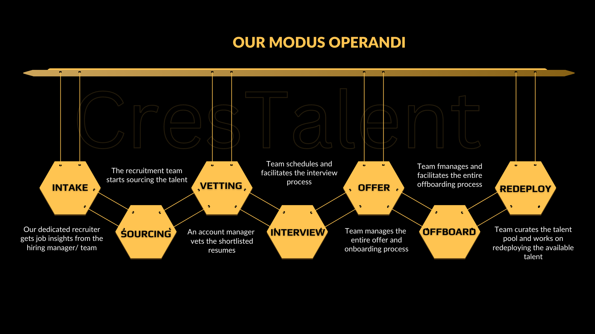 Our Modus operandi: Intake Calls - Sourcing - Vetting - Interview - Offer Management - offboarding - Redeployment
